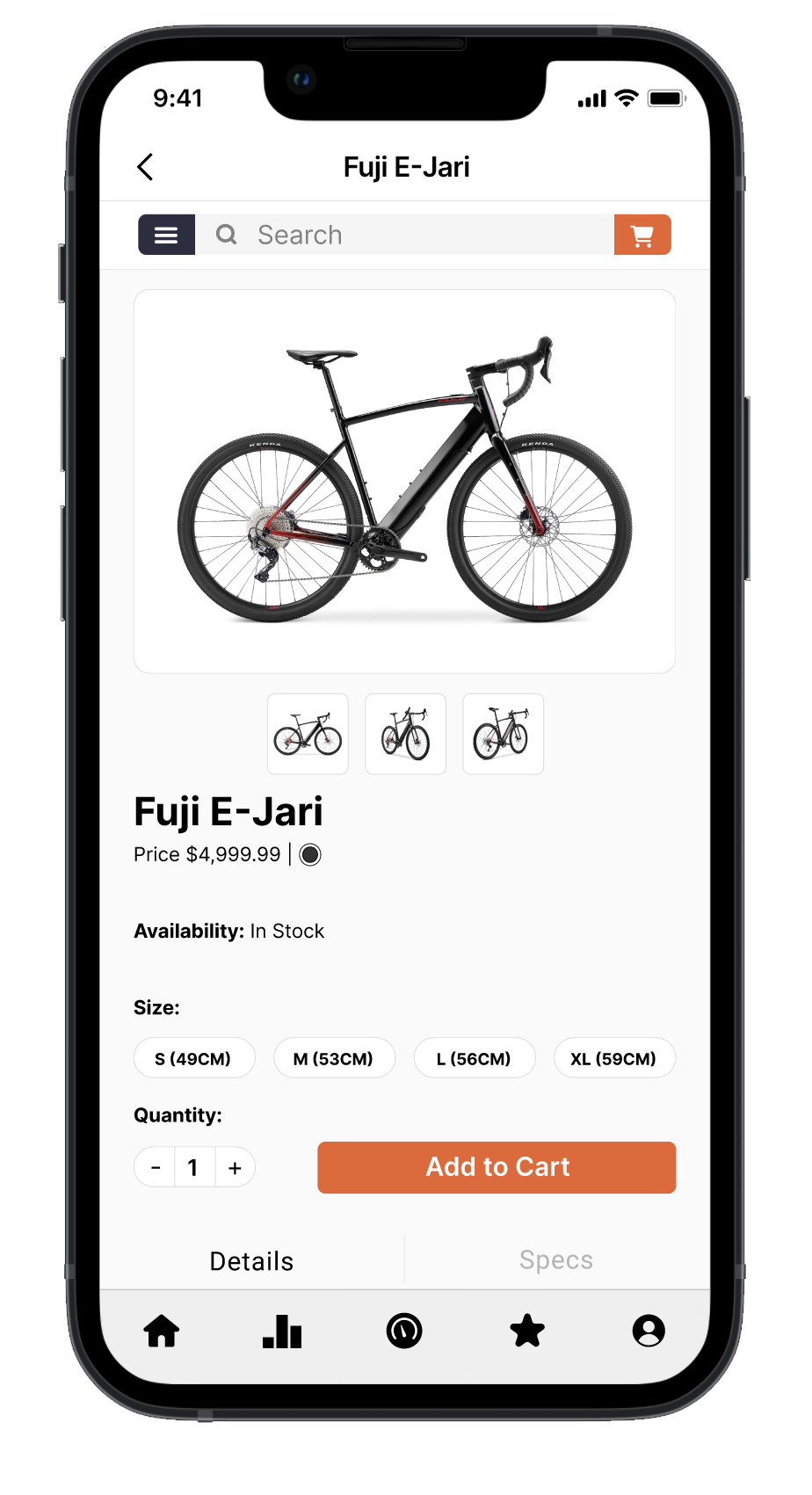 bike in detail, select size and quantity, and add it