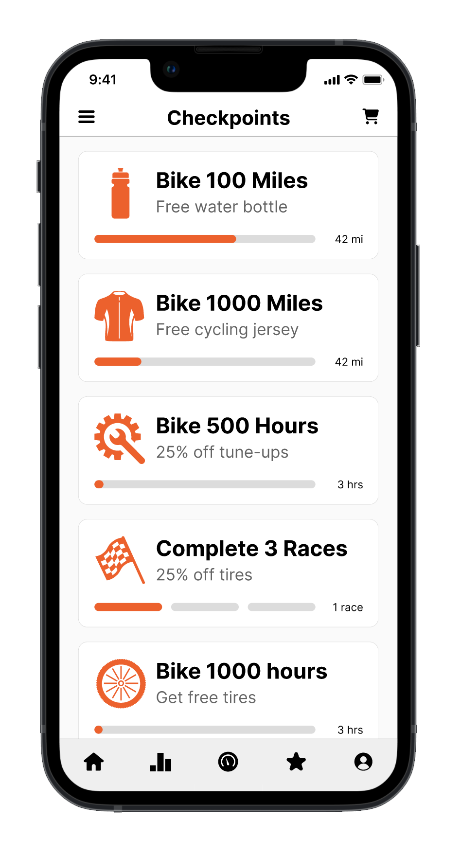 The Checkpoints section tracks users’ rides and translates their progress into meaningful rewards. By monitoring distance, milestones, and ride frequency, the app automatically awards incentives, like a free water bottle at 100 miles or a jersey at 1,000 miles. This feature not only motivates riders to stay active but also encourages repeat engagement with the Fixed Gear store, creating a fun, goal-oriented experience that blends fitness tracking with tangible rewards.